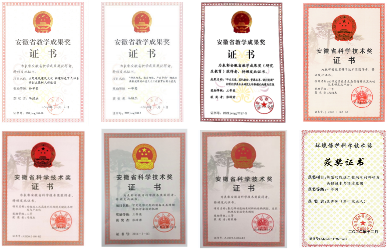 近年来,获安徽省教学成果奖3项,其中特等奖和一等奖各1项。获批教育部产学合作协同育人项目、安徽省重大教改项目、安徽省新型建筑材料现代产业学院等省部级教研项目20余项;承担国家自然科学基金、省部级科技项目20余项,获安徽省科技进步一等奖1项,二等奖1项,安徽省自然科学三等奖2项、环境保护科学技术一等奖1项。发表高水平学术论文100余篇,授权国家发明专利10余项,累计到账科研经费逾千万元。2023年化学学科进入ESI学科全球排名前1%。