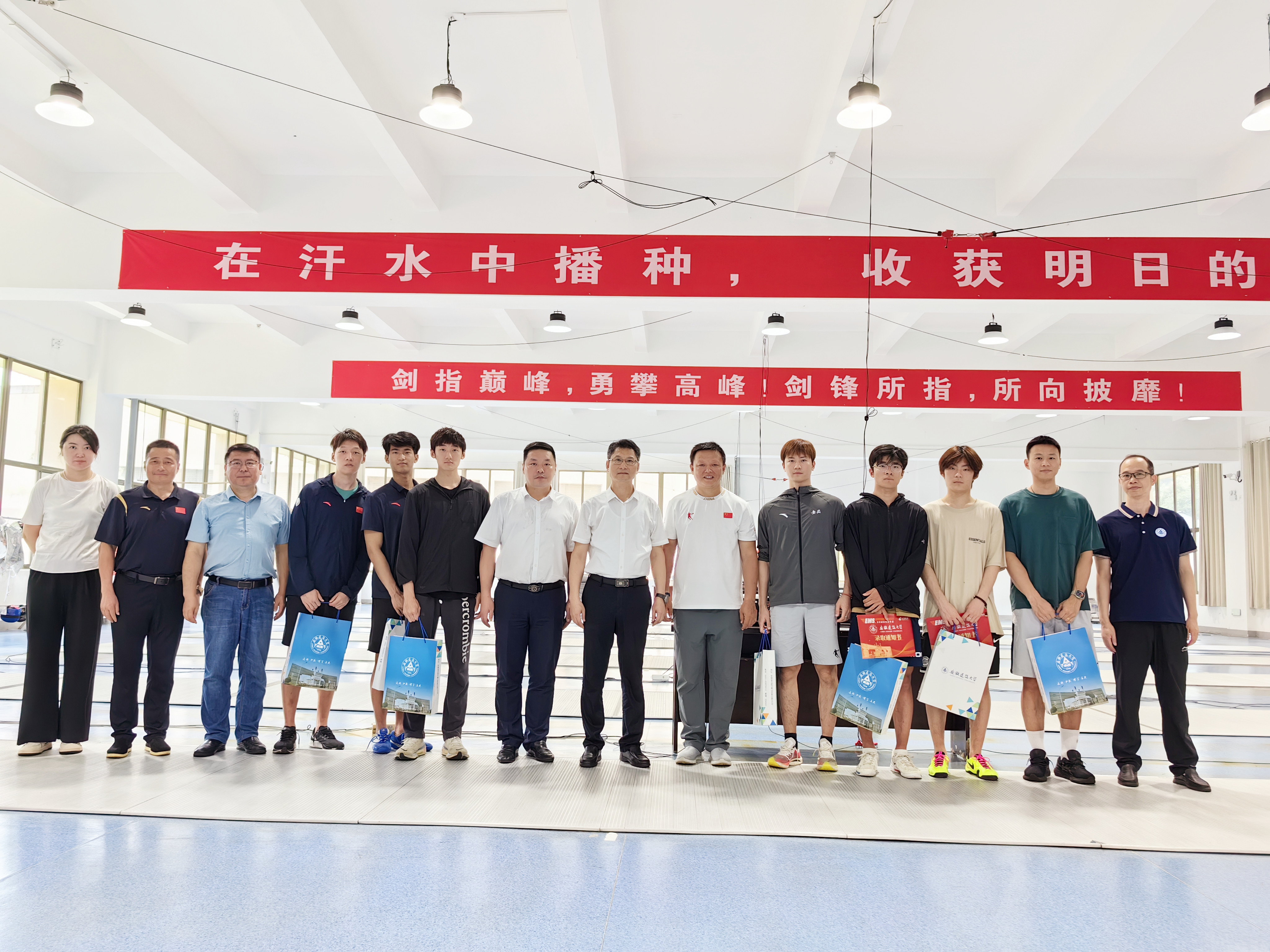 马文革一行走访了我校运动员训练、生活场地,与基地集训队负责人、安徽省击剑队花剑组主教练张亮亮深入交流,了解我校学子比赛、学习和生活情况。在基地击剑馆,马文革看望慰问了在此集训的我校全体高水平运动员和校友代表,为大家送上学校文创纪念品,亲切询问大家训练近况,勉励同学们以在巴黎奥运会刚刚夺得佳绩的沈晨鹏、陈海威、吴斌等学长为榜样,刻苦训练,认真学习,在即将到来的全国击剑冠军赛中再创辉煌。